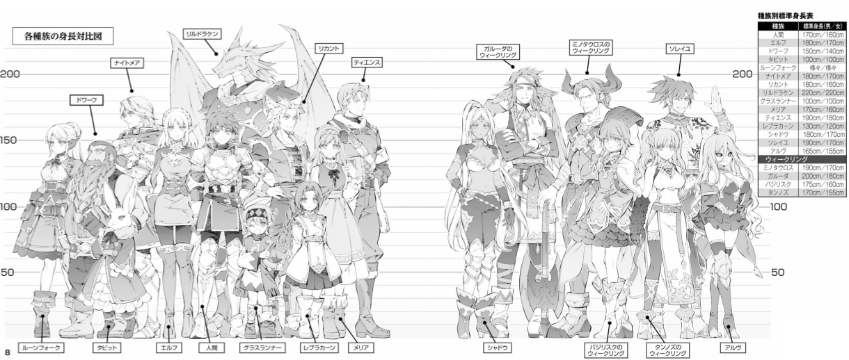 | リルドラケン | 0 | 30歳 | 300歳 | 鱗の皮膚、尻尾が武器、剣の加護/風の翼 | 竜人。翼と尻尾を持ち、短時間なら飛行可能。高い筋力と生命力を誇り、盾役に最適。ただし不器用。 |
